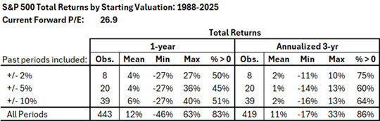 Historical periods with starting valuations similar to today include 1998, 2000, 2020, and 2021. Analysis of total returns from these “best-match” periods shows the following: