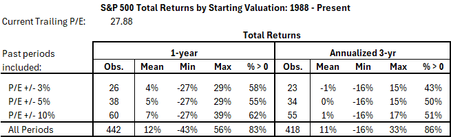 Historical periods with starting valuations similar to today include select months during 1998-2001, 2003, and 2020-21. Analysis of total returns from these “best-match” periods shows the following: